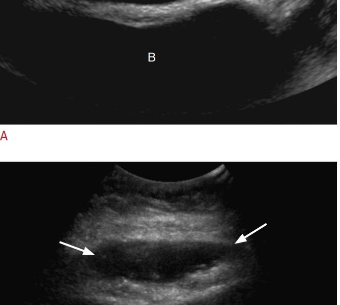 Hình 17. U nhầy nhú trong ống tụy (IPMN) nhánh bên ở bệnh nhân 72 tuổi. (A) Hình siêu âm cắt ngang ban đầu của tụy sử dụng đầu dò cong cho thấy một nang có vẻ là đơn hốc kích thước 0,7 cm (mũi tên) ở thân tụy. (B) Tại lần siêu âm theo dõi 3 tháng sau, đầu dò phẳng độ phân giải cao đã được sử dụng để đánh giá thêm, lúc này tổn thương (mũi tên) được mô tả chính xác hơn là một tổn thương dạng nang phân thùy kích thước 1,6 cm với một vách mỏng. Những phát hiện này nêu bật tầm quan trọng của việc lựa chọn đầu dò trong một số tình huống nhất định, có thể giúp cải thiện việc xác định đặc điểm của cấu trúc hoặc tổn thương tương đối nông. Các phát hiện trên chụp cộng hưởng từ mật tụy sau đó (không hiển thị) xác nhận các phát hiện siêu âm về IPMN nhánh bên.